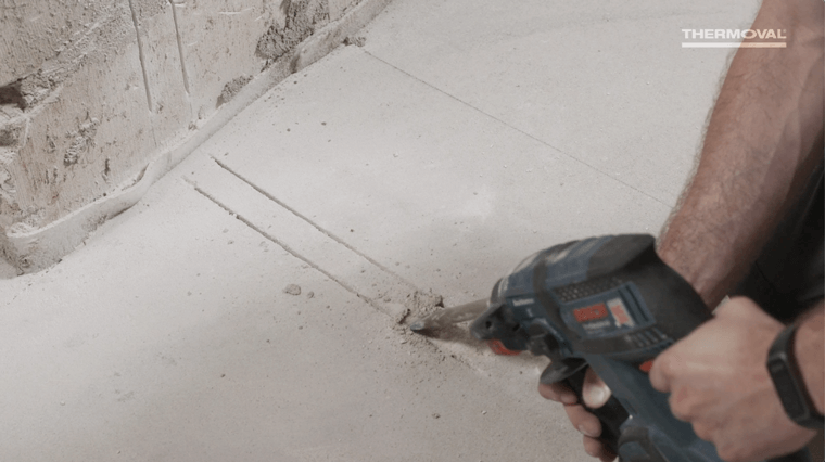 - Wykonaj kanał instalacyjny dla rurki ochronnej czujnika podłogowego — część w ścianie powinna być skierowana w linii prostej do podłogi, a część w podłodze mieć długość ok. 50–60 cm. Kanał w części na ścianie powinien być szerszy, aby pomieścić rurkę (peszel) z kablem zasilającym matę grzejną.