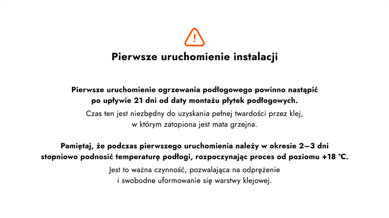 Pierwsze uruchomienie maty grzejnej pod płytkami jest możliwe dopiero po upływie minimum 21 dni od czasu montażu podłogi. Jest to niezbędne, by klej, w którym zatopiona jest mata, uzyskał odpowiedni stopień twardości. Proces uruchomienia instalacji należy rozpocząć od ustawienia temperatury 18ºC, a następnie stopniowo podnosić temperaturę przez 2–3 dni. Pozwoli to na odprężenie i swobodne uformowanie się warstwy klejowej.