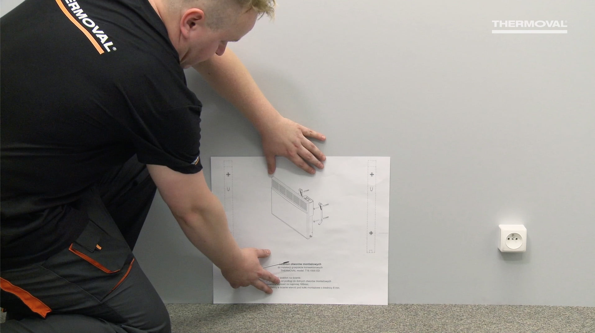 - Montaż rozpocznij od przyłożenia szablonu montażowego do ściany. Za jego pomocą odznacz miejsca na kołki montażowe.