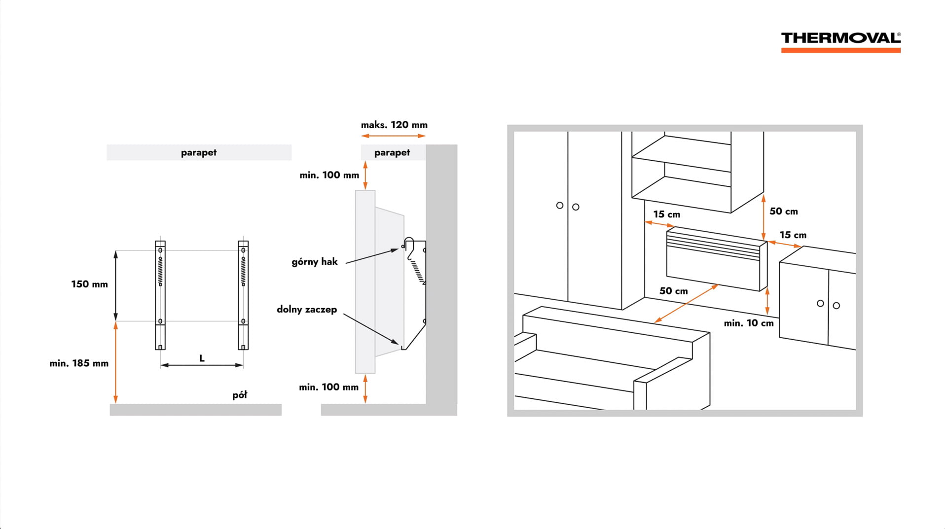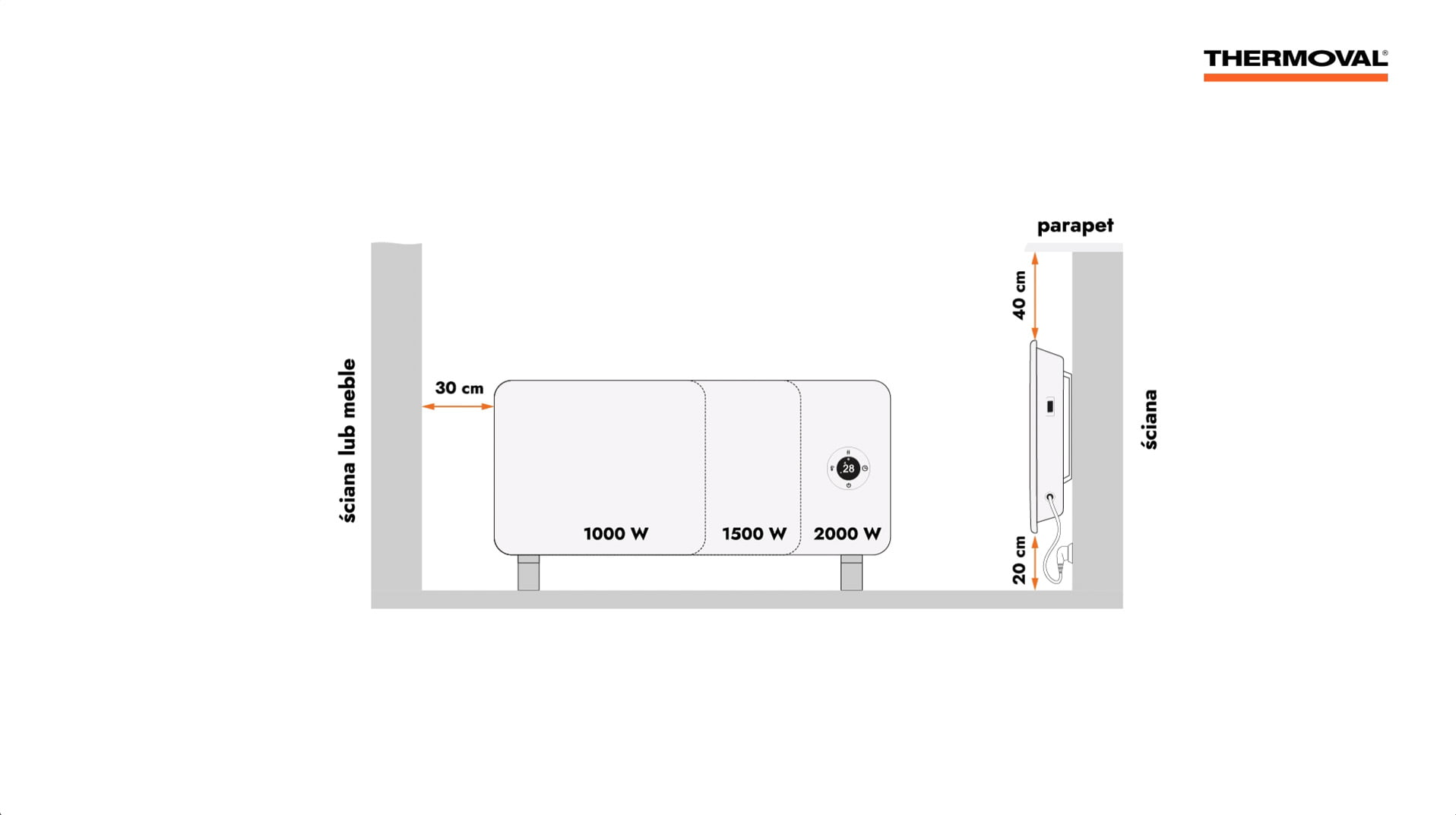 W pierwszej kolejności należy określić miejsce, w którym grzejnik będzie eksploatowany. Może być zainstalowany na ścianie lub pracować ustawiony na nóżkach. W przypadku montażu naściennego grzejnika, należy zachować odległości powierzchni grzejnika do przedmiotów w pomieszczeniu.