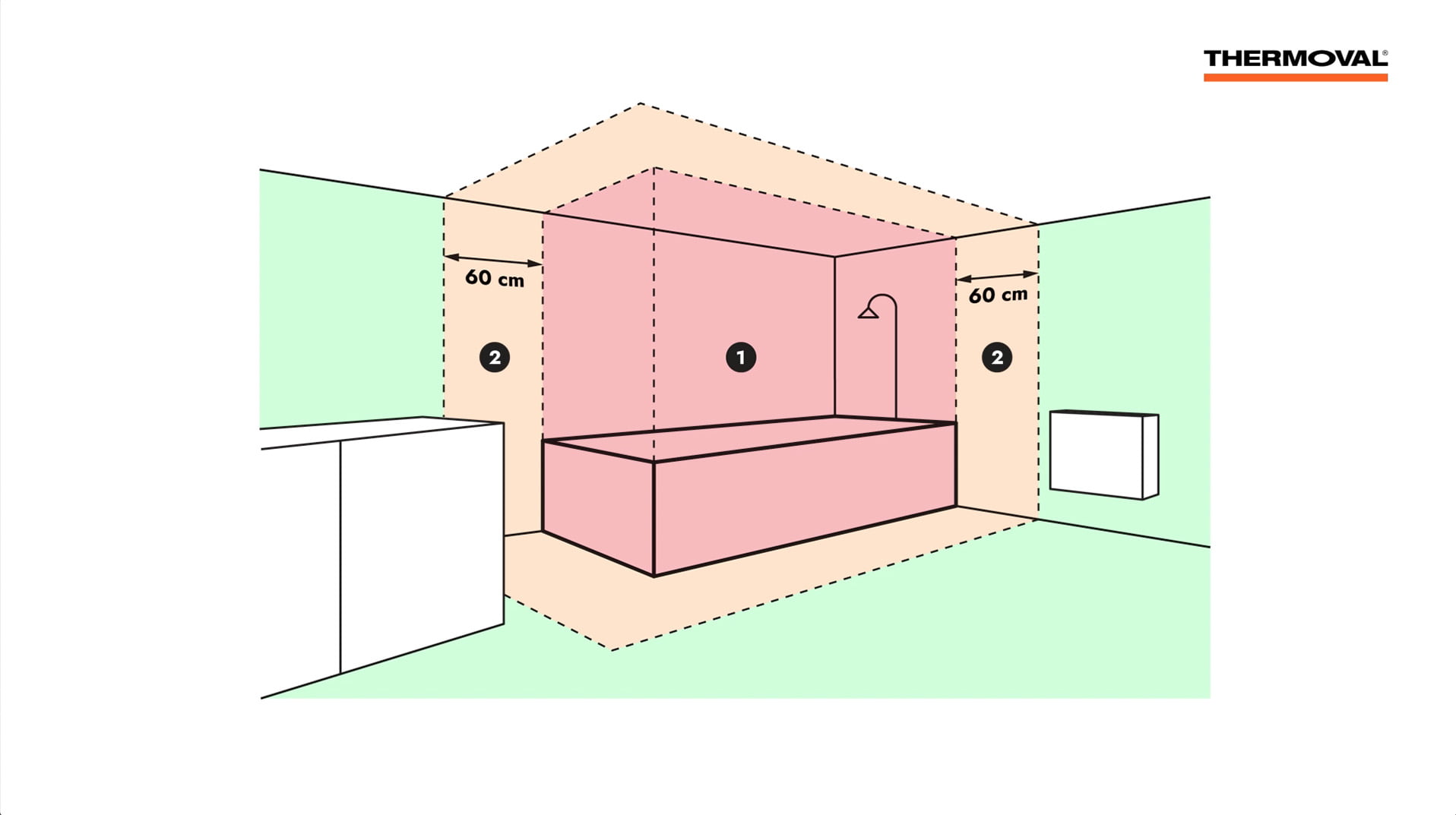 - w strefie 2, jeżeli osoba znajdująca się w wannie, pod prysznicem może sięgnąć do grzejnika lub jego przewodu zasilającego.
